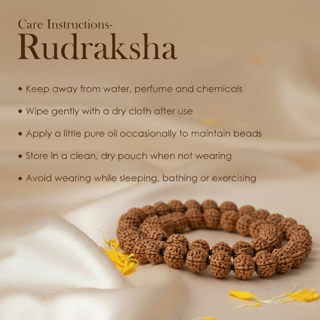 Wear the bracelet on your right wrist (for men) or left wrist (for women) during daily activities or spiritual rituals. Clean with a soft cloth regularly and energize under morning sunlight or by chanting the Beej Mantra to maintain its spiritual vibration.