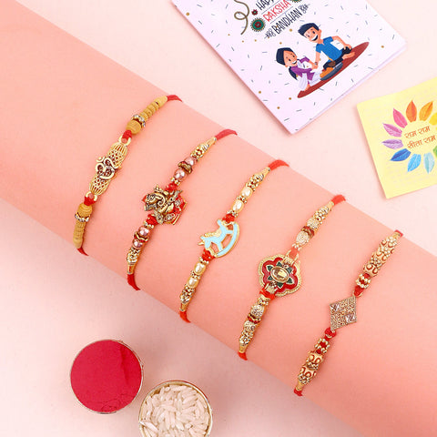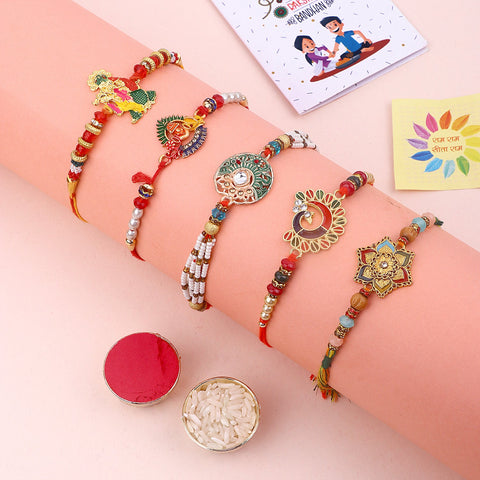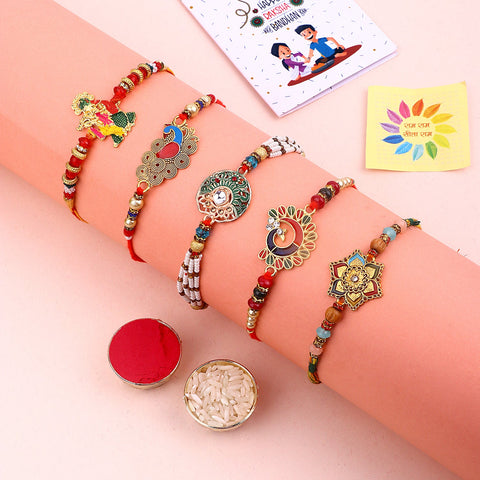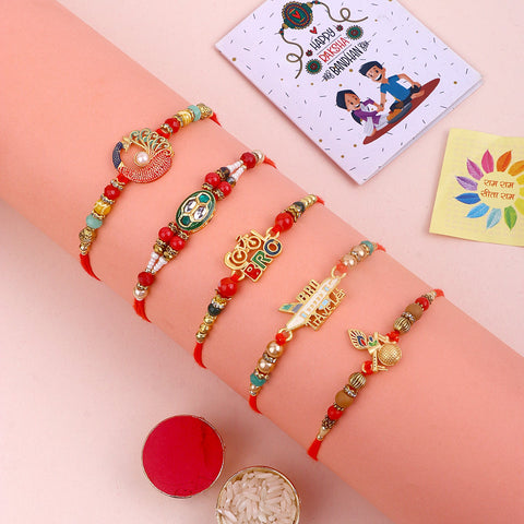 Beaded Bhaiya Rakhi Set of 5: Adorned with colorful beads, these rakhis represent the joyous journey of growing up side by side. Embrace the nostalgia and affection with this delightful beaded rakhi set.