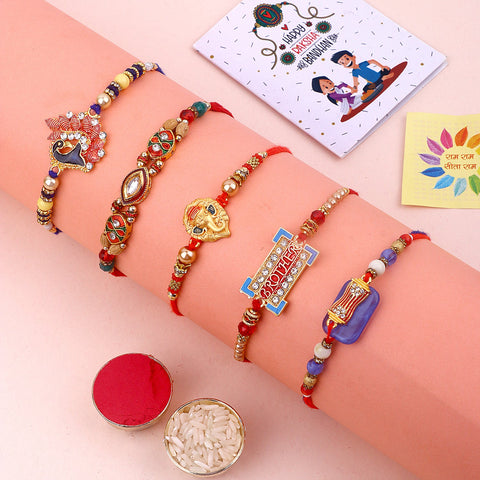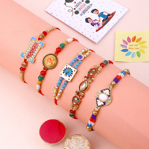 This Raksha Bandhan, make your brothers feel cherished and loved with our Set of 5 Bhaiya Rakhis. Express your heartfelt emotions and create everlasting memories with these exquisite pieces of artistry.