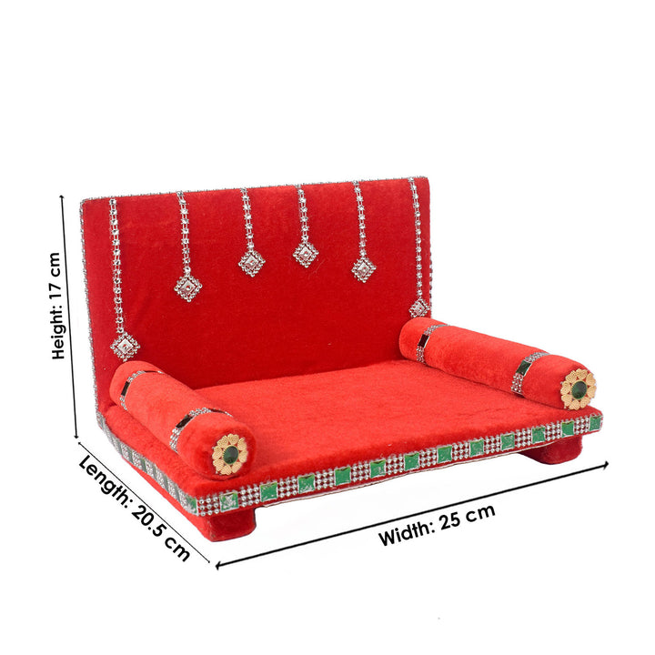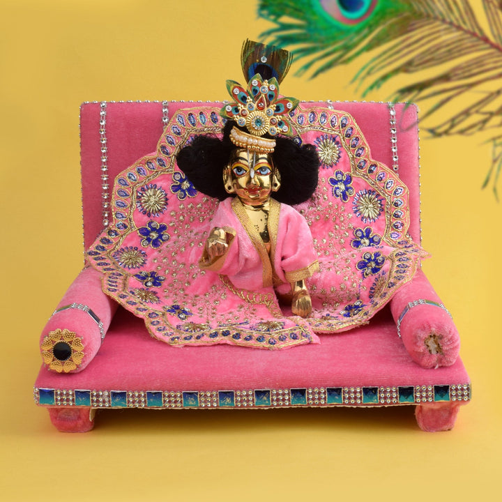 As you place your Laddu Gopal on this sacred throne, watch as the velvet embraces the little lord, showering blessings and grace upon your home. Its charming allure and captivating design make it a true centerpiece of devotion, adding a touch of splendor to your worship space.