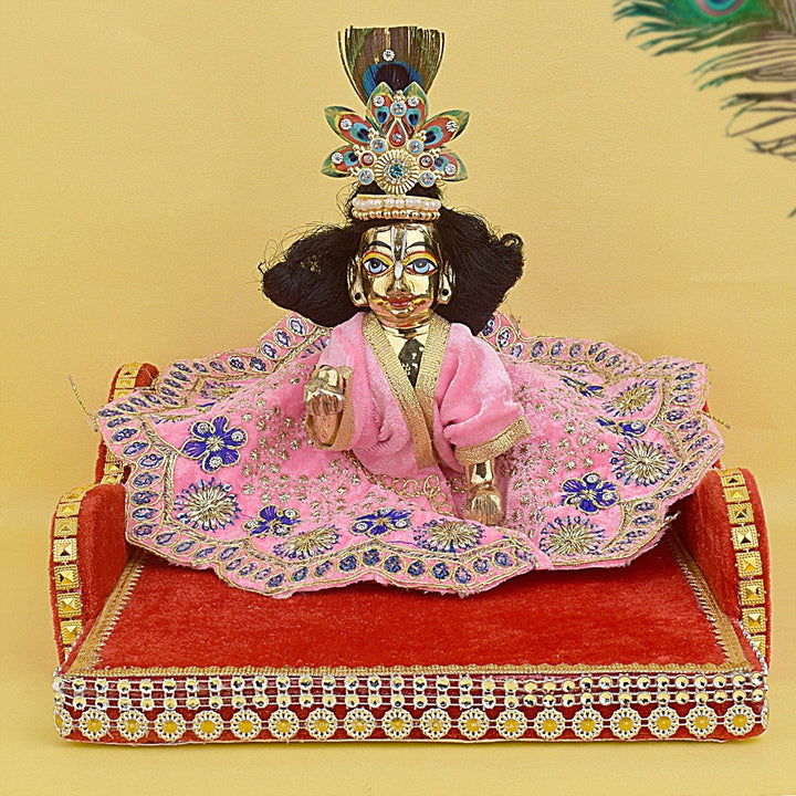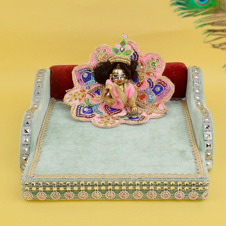 As you place your Laddu Gopal on this sacred throne, watch as the velvet embraces the little lord, showering blessings and grace upon your home. Its charming allure and captivating design make it a true centerpiece of devotion, adding a touch of splendor to your worship space.