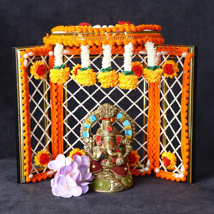 Description: On significant festivals, Phool Banglas are typically used as a decoration and a backdrop for Lord Radha Krishna and Laddu Gopal and Ganpati. These phool banglas are made by the most talented artisans in West Bengal and Uttar Pradesh. On the occasions of Ganesh Chaturthi and Janmashtami, these are widely used at pandals and mandirs as well as homes and businesses.