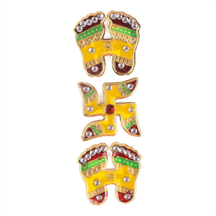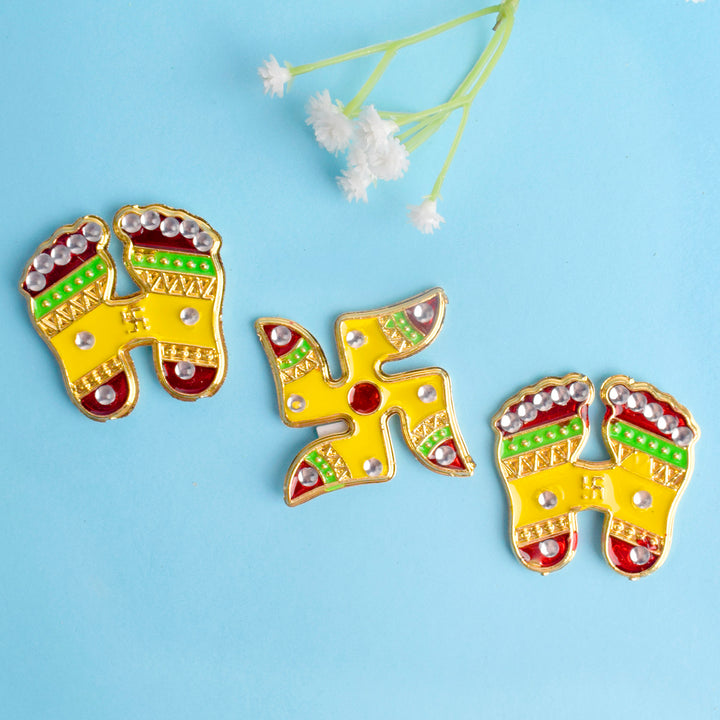 Item Name: Diwali Bliss Yelllow charan Paduka and Swastik Sticker s Set of 3