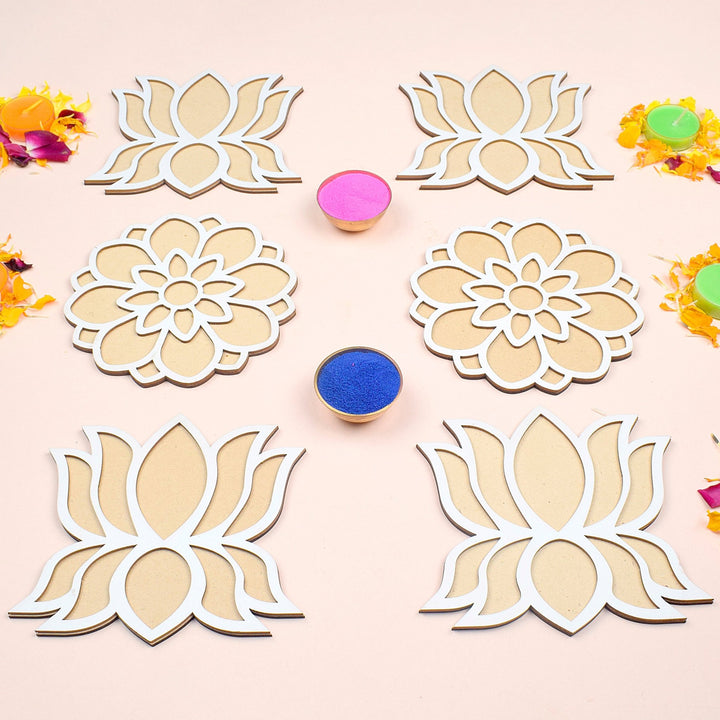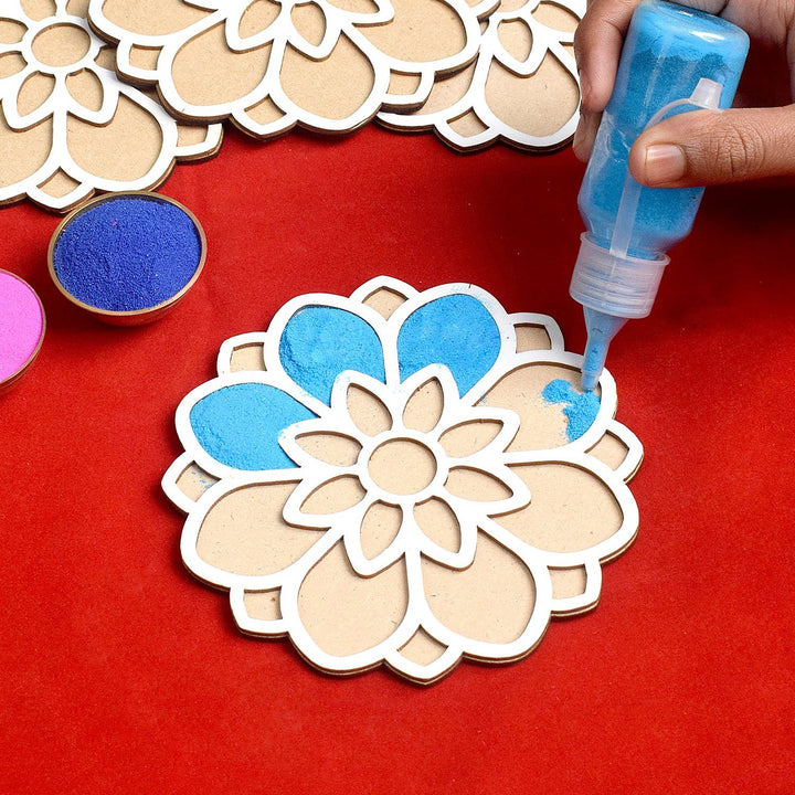 • Material & Size: Portable Rangoli crafted from MDF material not flexible like any other so that you can easily move even filled rangoli here and there. They are available in four exquisite designs, each measuring 6 inches.