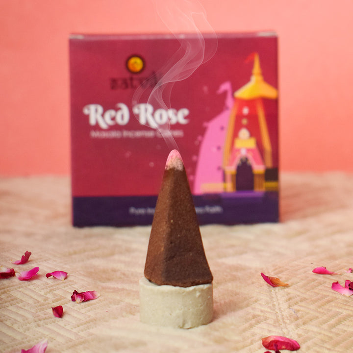 Red rose incense cones | Pure masala rose dhoop cones | Natural rose incense | Spiritual rose fragrance cones | Meditation rose incense | Love and peace incense cones | Herbal rose incense cones | Handcrafted masala incense | Devotional rose dhoop | Premium rose incense for rituals