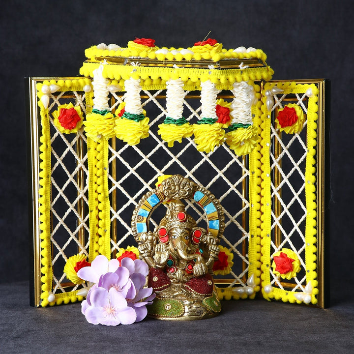 Description: On significant festivals, Phool Banglas are typically used as a decoration and a backdrop for Lord Radha Krishna and Laddu Gopal and Ganpati. These phool banglas are made by the most talented artisans in West Bengal and Uttar Pradesh. On the occasions of Ganesh Chaturthi and Janmashtami, these are widely used at pandals and mandirs as well as homes and businesses.