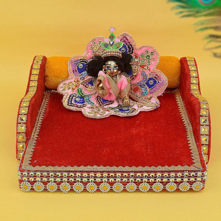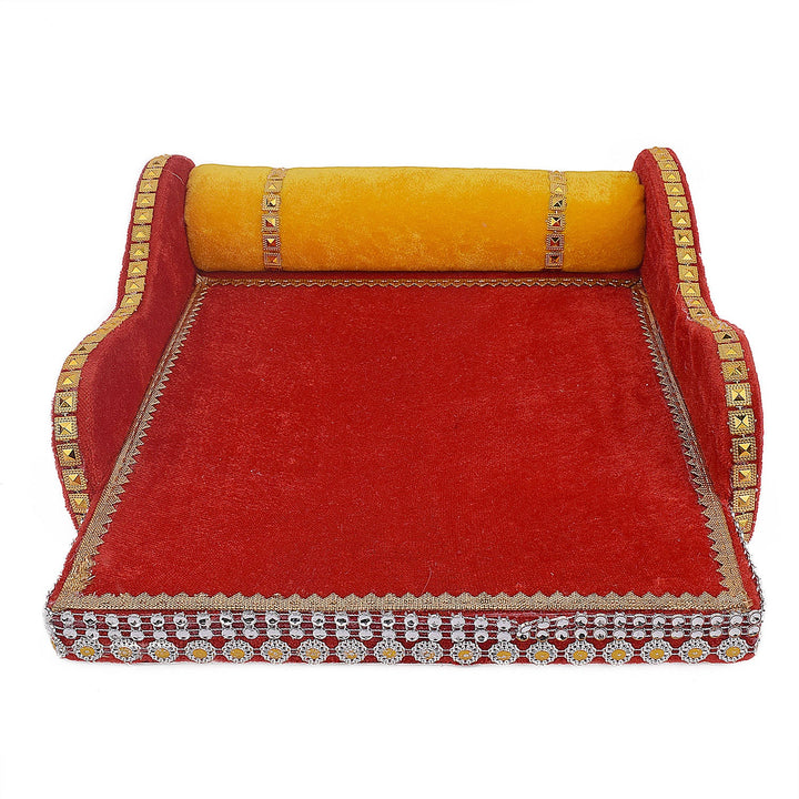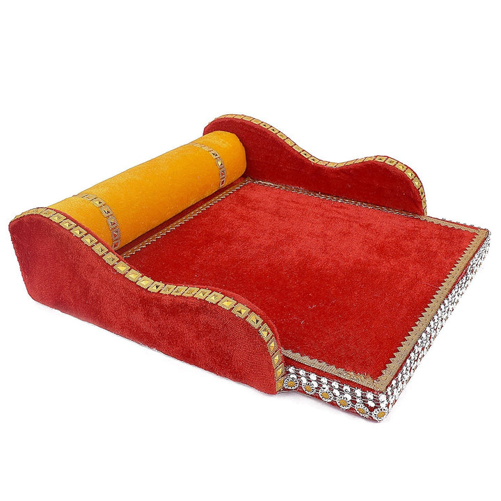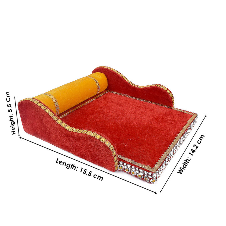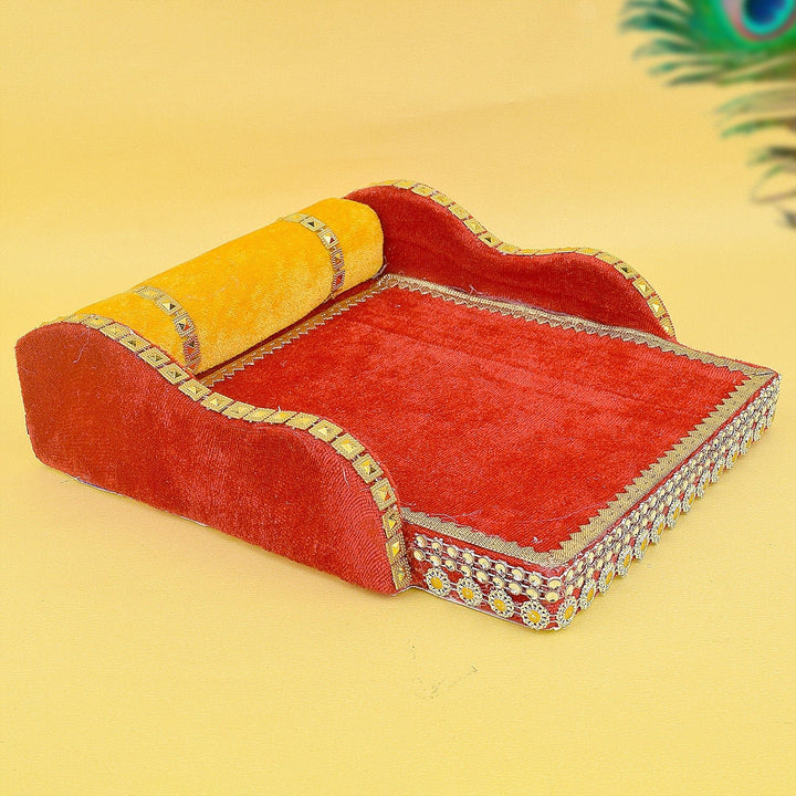 laddu gopal velvet bed | krishna sleeping bed small | red velvet bed for deity | divine kanha ji bedding | traditional gopal ji bed | laddu gopal pooja bed | mdf velvet bed for laddu gopal | soft velvet pooja accessory | satvikstore krishna bed