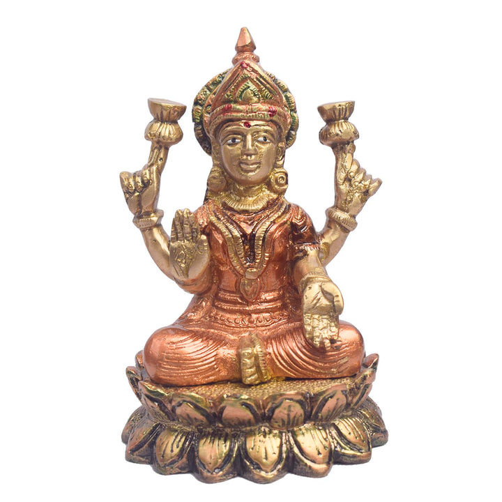• Lakshmi, the Goddess of wealth, prosperity, and fortune, is typically depicted with her graceful and serene posture, holding lotus flowers and gold coins, symbolizing abundance and blessings.