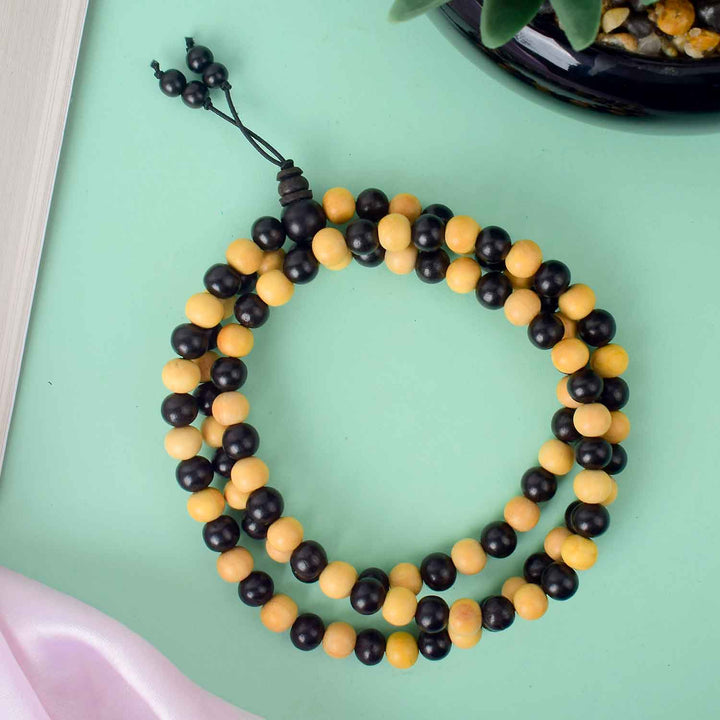 About Product: The 8mm Ebony and White Scented Mala is a unique spiritual accessory blending the protective power of Ebony wood with the calming aroma of White Sandalwood. Each bead is handcrafted and polished for a smooth finish. This dual-energy mala helps create inner stillness during meditation and spiritual practices. The naturally scented white chandan beads offer a peaceful aura, while the ebony beads enhance grounding and focus.