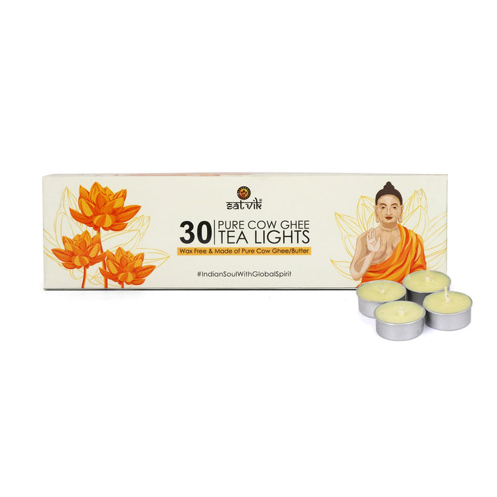 About Product: Satvik Presents Tibetan Buddhist Butter/ Pure Cow Ghee Tea Light Pack of 30 Filled with Tibetan Buddhist Butter Lamp, 1.5 Hours Burning Time (Pack of 1)