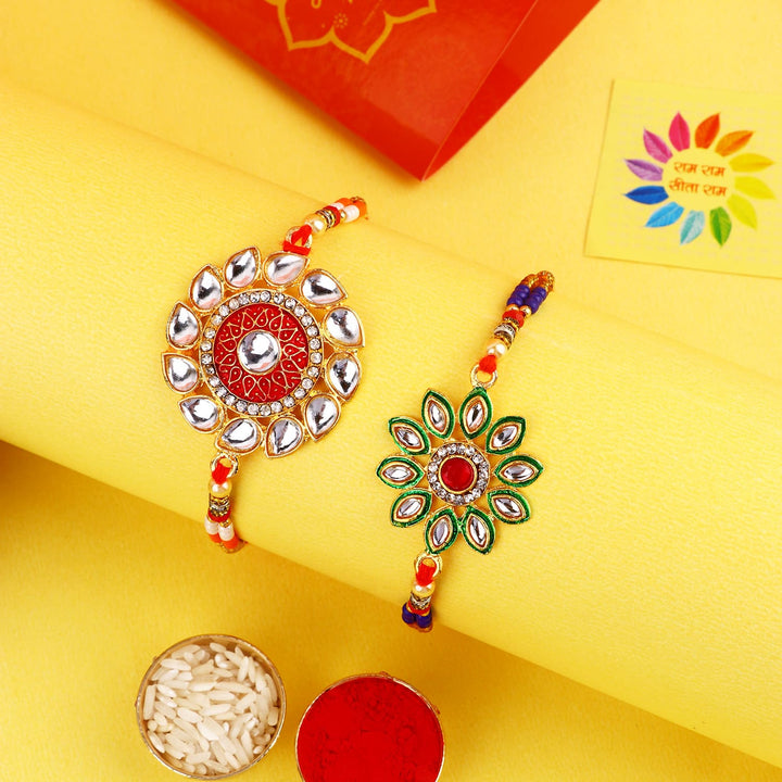 • Item Name: Graceful Kundan Rakhi for a Cherished Tie (Set of 2)