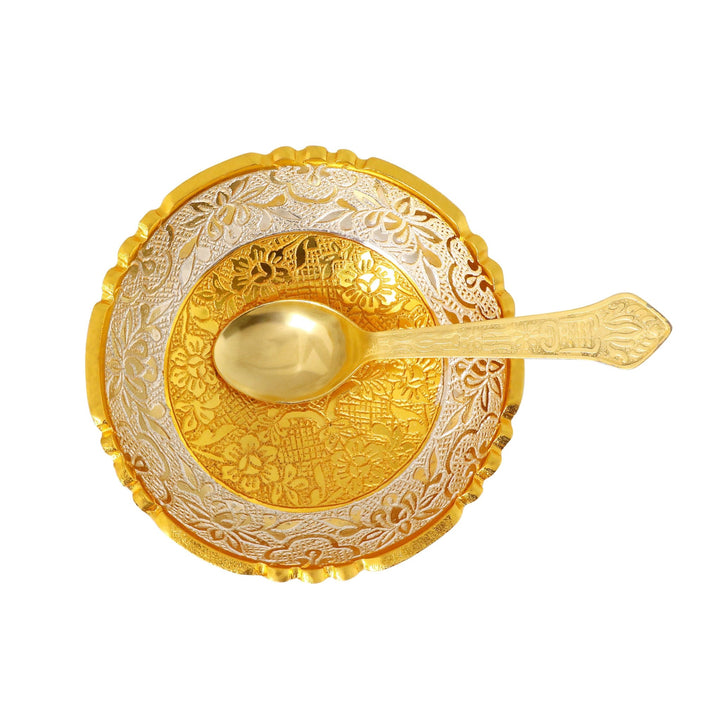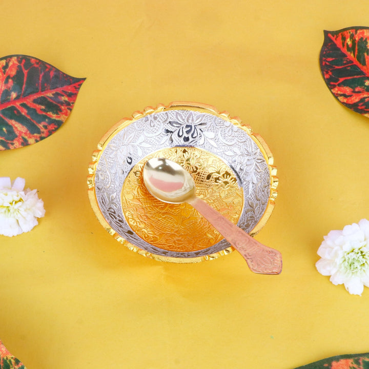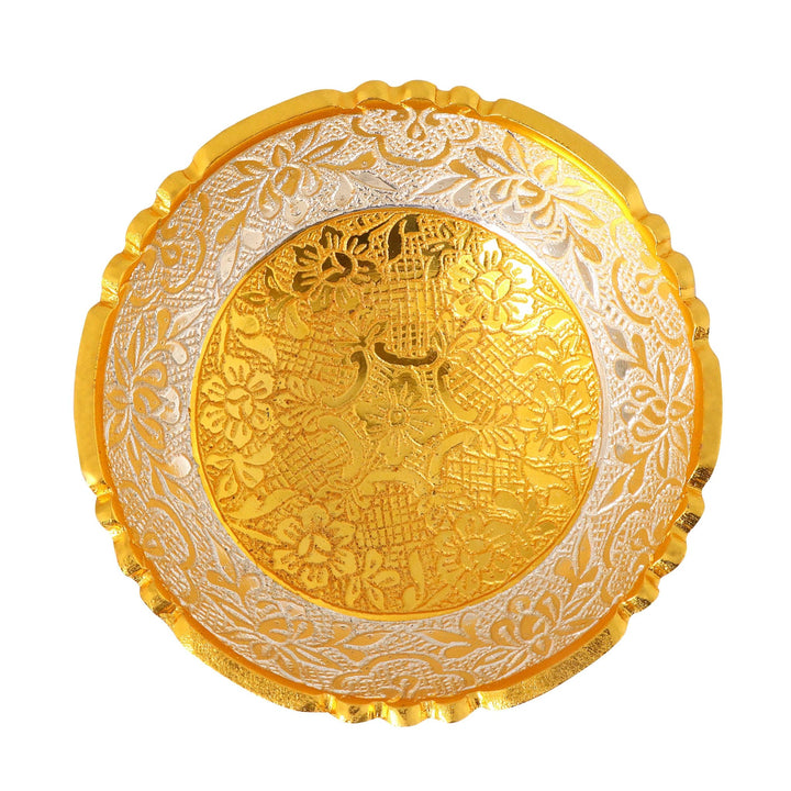 golden bowl | embossed bowl | decorative pooja bowl | floral design bowl | brass base bowl | festive decor bowl | traditional Indian bowl | pooja accessories | home decoration bowl | gifting bowl |