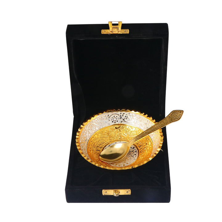 About Product: Satvik Presents Gifts for all Occasions. Satvik Presents Royal Wedding Diwali Housewarming Gift Set which comes with Unique Royal Velvet Box Premium Gift Packing Set. The Bowl Set is made of Aluminum with Gold Silver Plated, This Bowl Set has eye-catching accents on its exterior. Sporting a silver finish, this Bowl Set makes a wonderful gift for Friends, Family, Corporate Gifting, Colleagues, and Business gifts. Christmas Gift, Perfect Gift.
