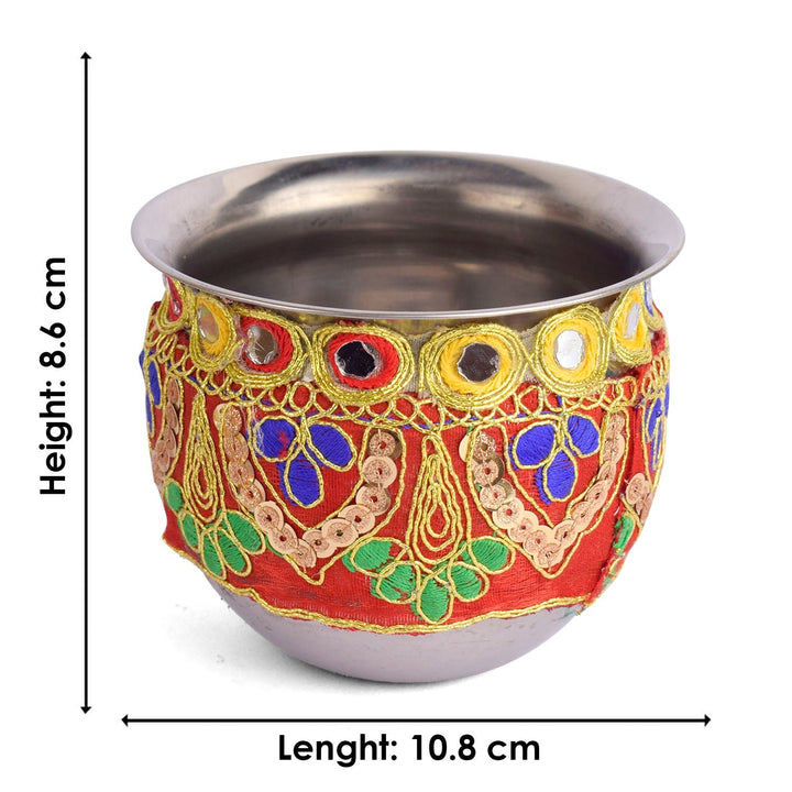Design: Beautiful Handcrafted Designer Karwa Thali with Fabric all over the Thali and Lace Work all over the Lota and Sieve (Channi), Which makes it more Attractive.