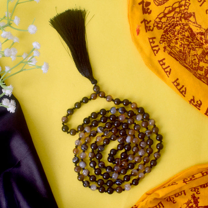 This Premium Hakik Jap Mala, made from Brown & Black Hakik (Agate - SiO₂), is a powerful spiritual tool that provides grounding, stability, and protection from negativity. The combination of brown and black hues symbolizes strength, resilience, and deep-rooted connection to the earth, making it perfect for meditation, mantra chanting, and spiritual shielding.